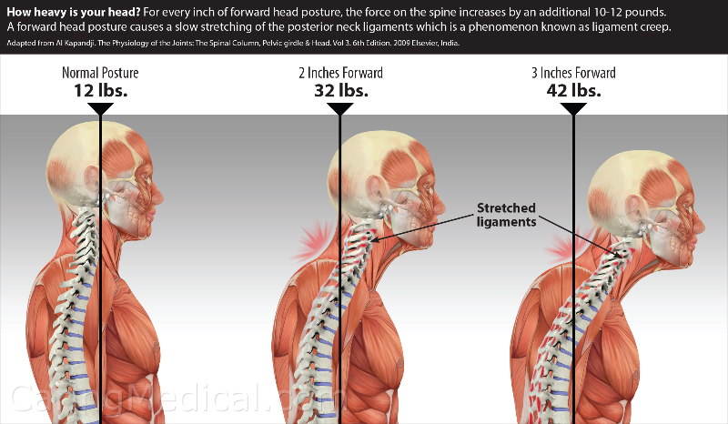 Every 2.5 cm your head moves forward from its neutral position, it can increase the effective weight on your cervical spine by approximately 4.5 kg.